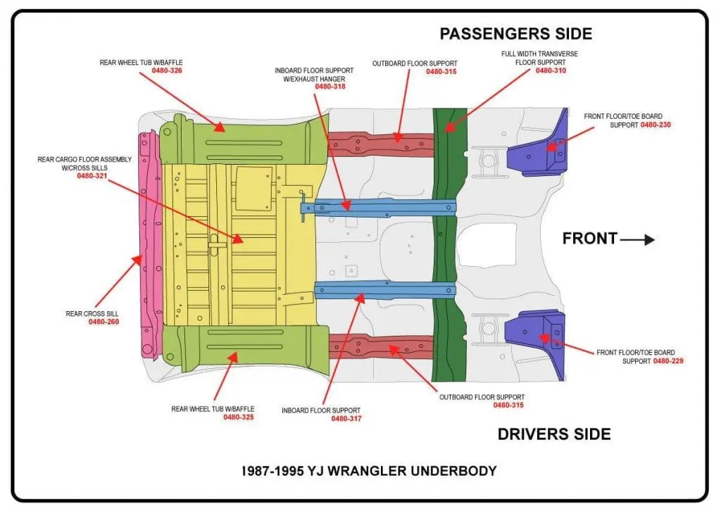 We know that Jeep enthusiasts love their Wranglers, and they drive them everywhere. From the daily commute to and from work, to the weekend camping or mud bog outing, Wranglers are the versatile vehicle that let us express ourselves and enjoy the great outdoors. As the years pass, nature eventually takes its toll on these great vehicles. It might be road salt or grime buildup from thousands of miles of daily commuting, or one too many large rocks scrapped across the undercarriage, but eventually your Wrangler’s body is probably going to need some TLC. At Raybuck, we know the common areas on these vehicles that get damaged from off-roading, or that eventually rot away from salt buildup, and we strive to offer quality replacement panels to help fix your Jeep. The chart below shows a lot of the aftermarket replacement panels that we have for the undercarriage of the 1987-1995 Jeep Wrangler, and you can click here or on the chart to see a listing of these and other body parts that we have for this Jeep. If you have any questions about these parts, or about fixing your Jeep Wrangler, you can always call, email or online chat with one of our knowledgeable reps as well.
