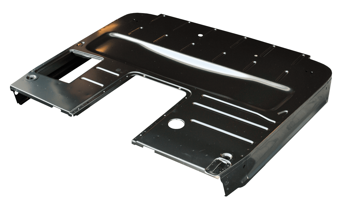 All of our replacement floor panels are stamped steel. The stamping process starts with a 3D scan of an OEM part which produces an OEM-like fitment. The old panel will need to be cut out so that the new one can be welded in its place.
