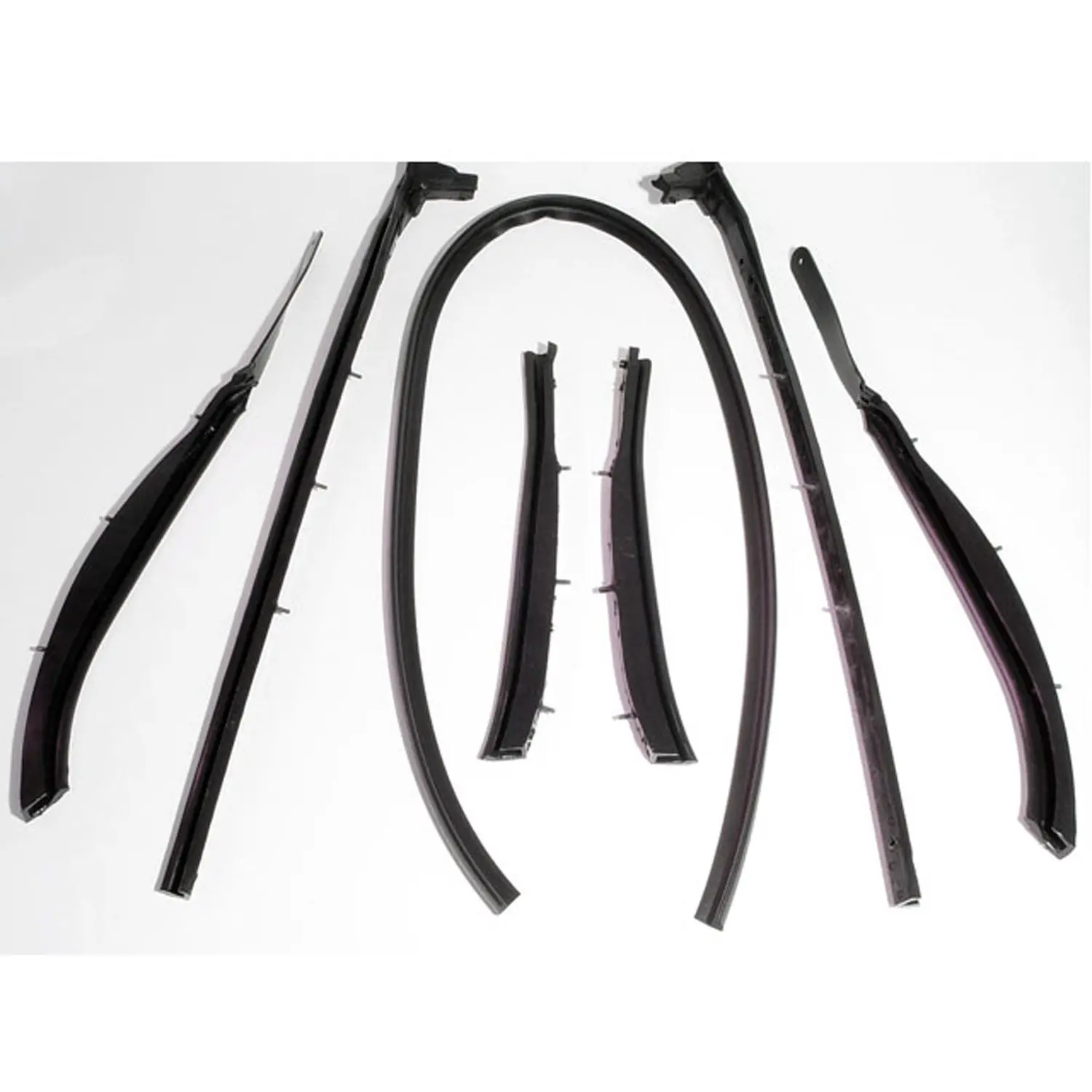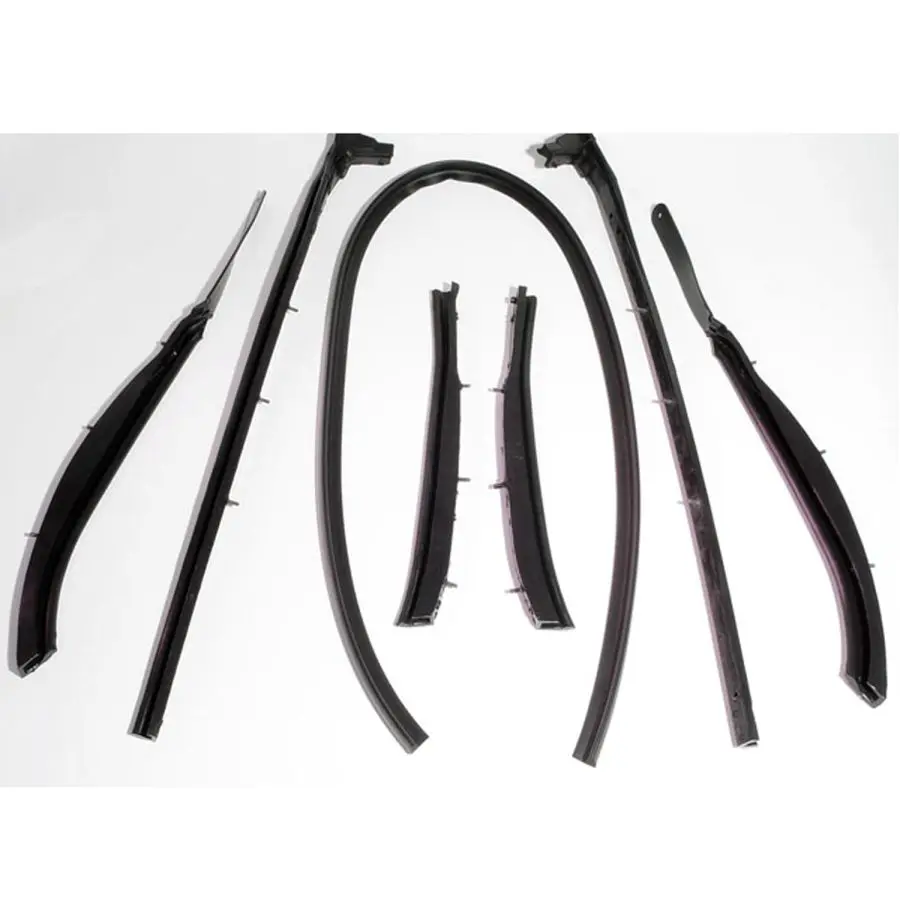 Convertible Top Roof Rail Kit. 7-Piece set includes all right and left side top rail seals and windshield top header seal. Made with steel core and threaded studs. Replaces OEM #’s 4783-608-09, 4780-555-6, 4780-553-4 Better sealing than competitor brands. Guaranteed to never leak. None of Metro’s parts use accelerants or cheap fillers in the molding processes, which can cause the part to prematurely age and fail