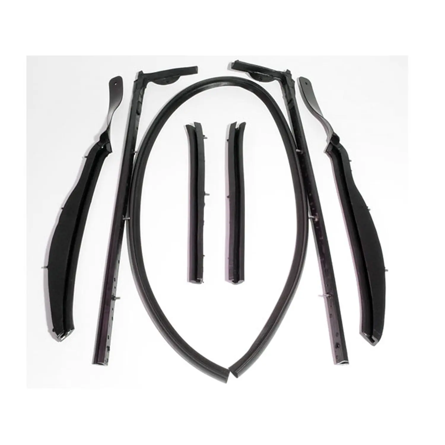 Convertible Top Roof Rail Kit. 7-Piece set includes all right and left side top rail seals and windshield top header seal. Made with full steel cores and threaded studs. Middle section is 13-3/4″ long. Note: ’61 model year may need some modifications. Better sealing than competitor brands. Guaranteed to never leak. None of Metro’s parts use accelerants or cheap fillers in the molding processes, which can cause the part to prematurely age and fail