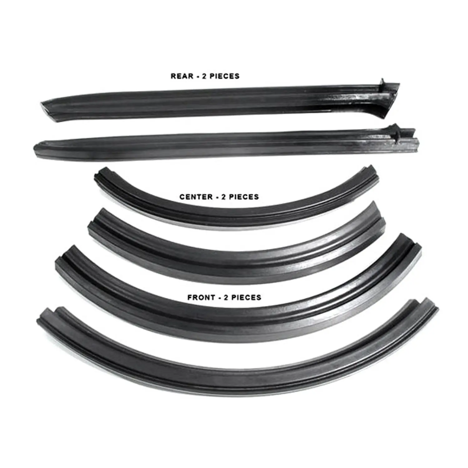 Convertible Roof Rail Seals/Gaskets. Includes all left and right side components (2-front, 2-center & 2-rear sections). 6-Piece Set Better sealing than competitor brands. Guaranteed to never leak. None of Metro’s parts use accelerants or cheap fillers in the molding processes, which can cause the part to prematurely age and fail