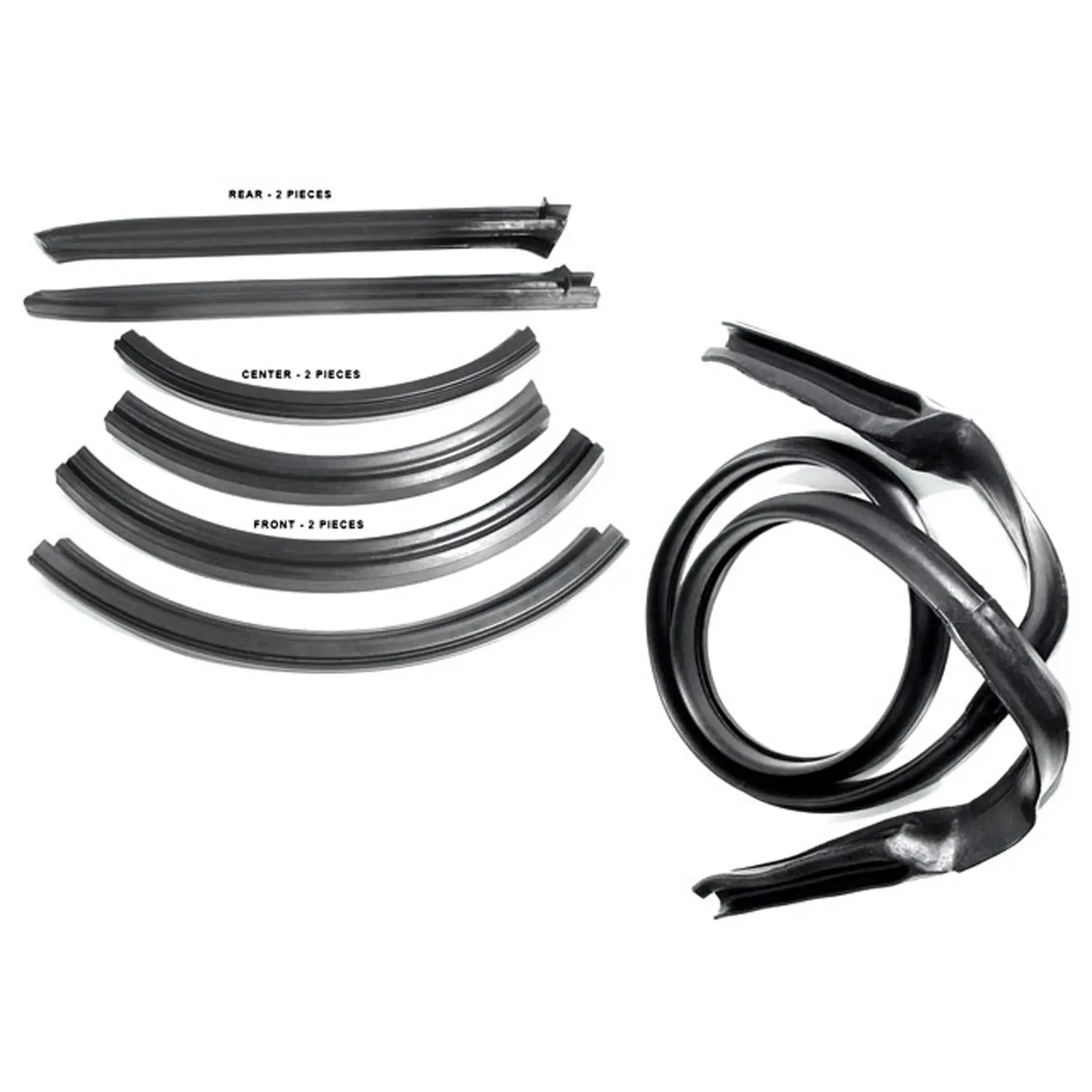 Convertible Top Seal/Gasket Set. Includes header Seal/Gasket and all left and right side roof rail components(2-left, 2-center & 2 rear sections). 7-Piece Set Better sealing than competitor brands. Guaranteed to never leak. None of Metro’s parts use accelerants or cheap fillers in the molding processes, which can cause the part to prematurely age and fail