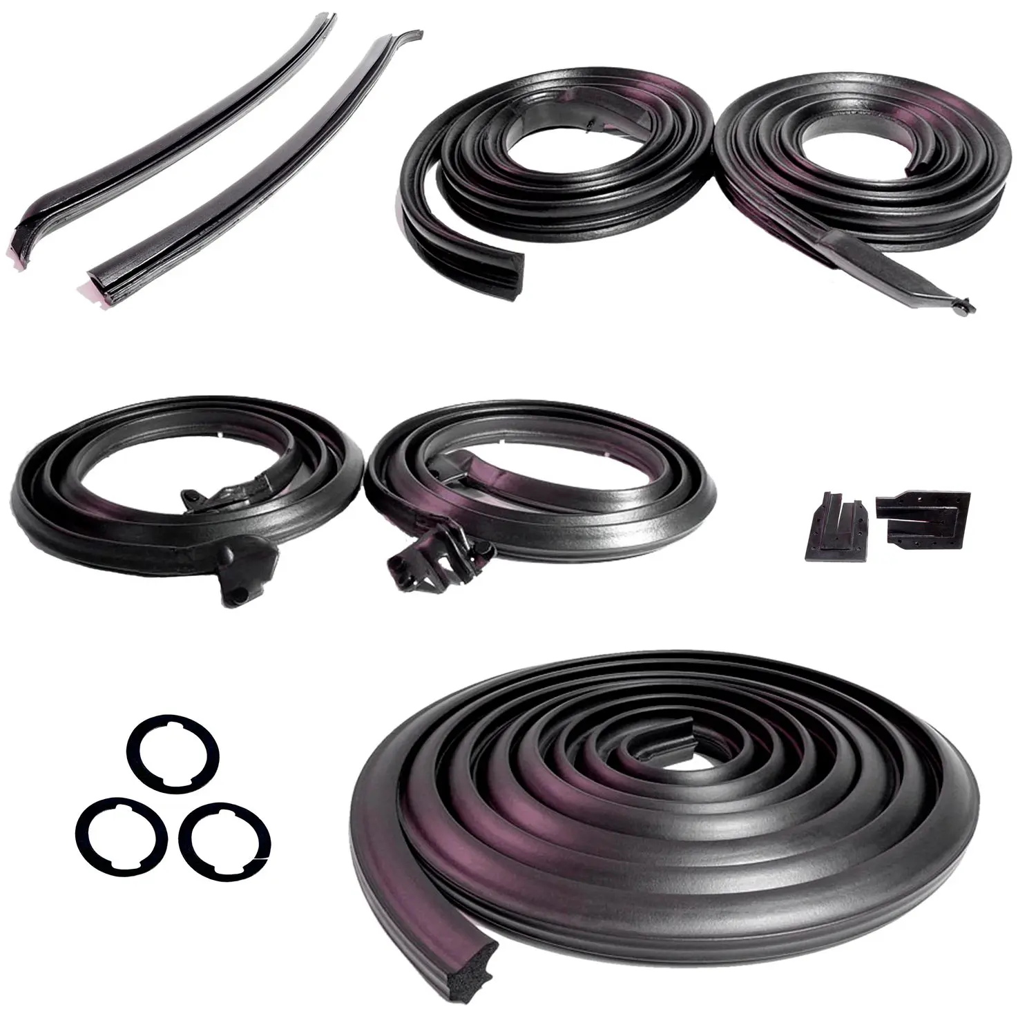 Master Kit for 2-Door Hardtops. Door Seal(LM 12), Roof Rail Seals/Gaskets(RR 5001), Trunk Seal(TK 46-16), Door Lock Pillars(ALP 5000), 3-Lock Cylinder Pads(UM 1600-100), Rear Roll-up Seal(VS 3-L) Convenient kit tailored for your vehicle. Every part included is made of the highest quality