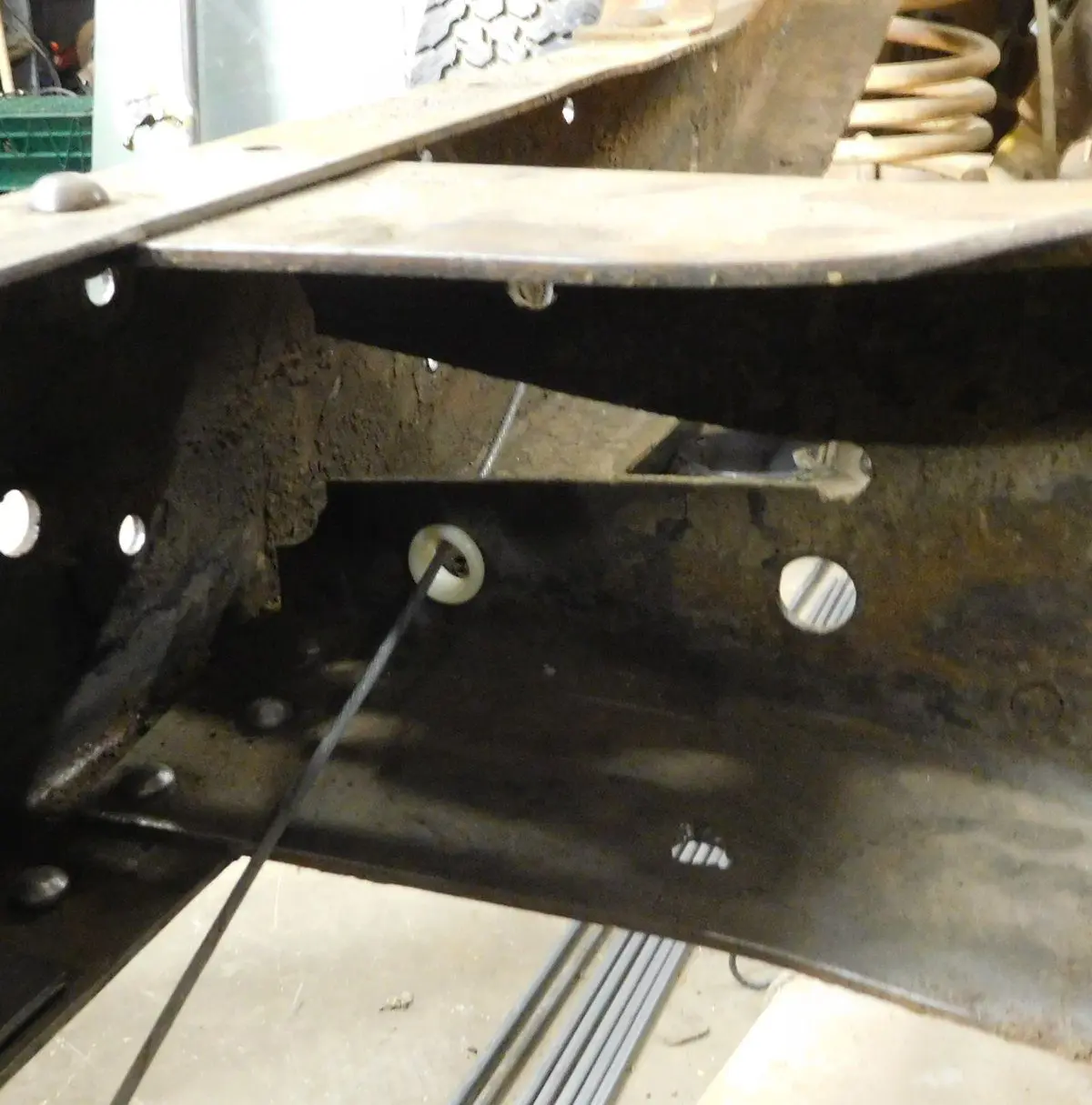 This part contains 2 pieces of the nylon guide bushings that go in the frame crossmember to prevent the e-brake cable from rubbing.