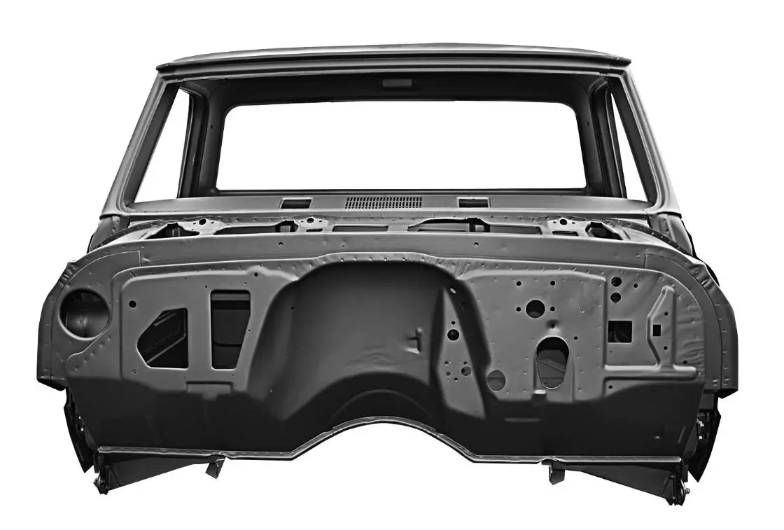A: Dynacorn Classic Body Shells are 100% all-steel. Trunk floor thickness 1.0mm. Rocker panel thickness 2.0mm. Rocker panel inner brace thickness 3.0mm. Rear frame rails thickness 2.3mm. Firewall and torque bar thickness 1.2mm.