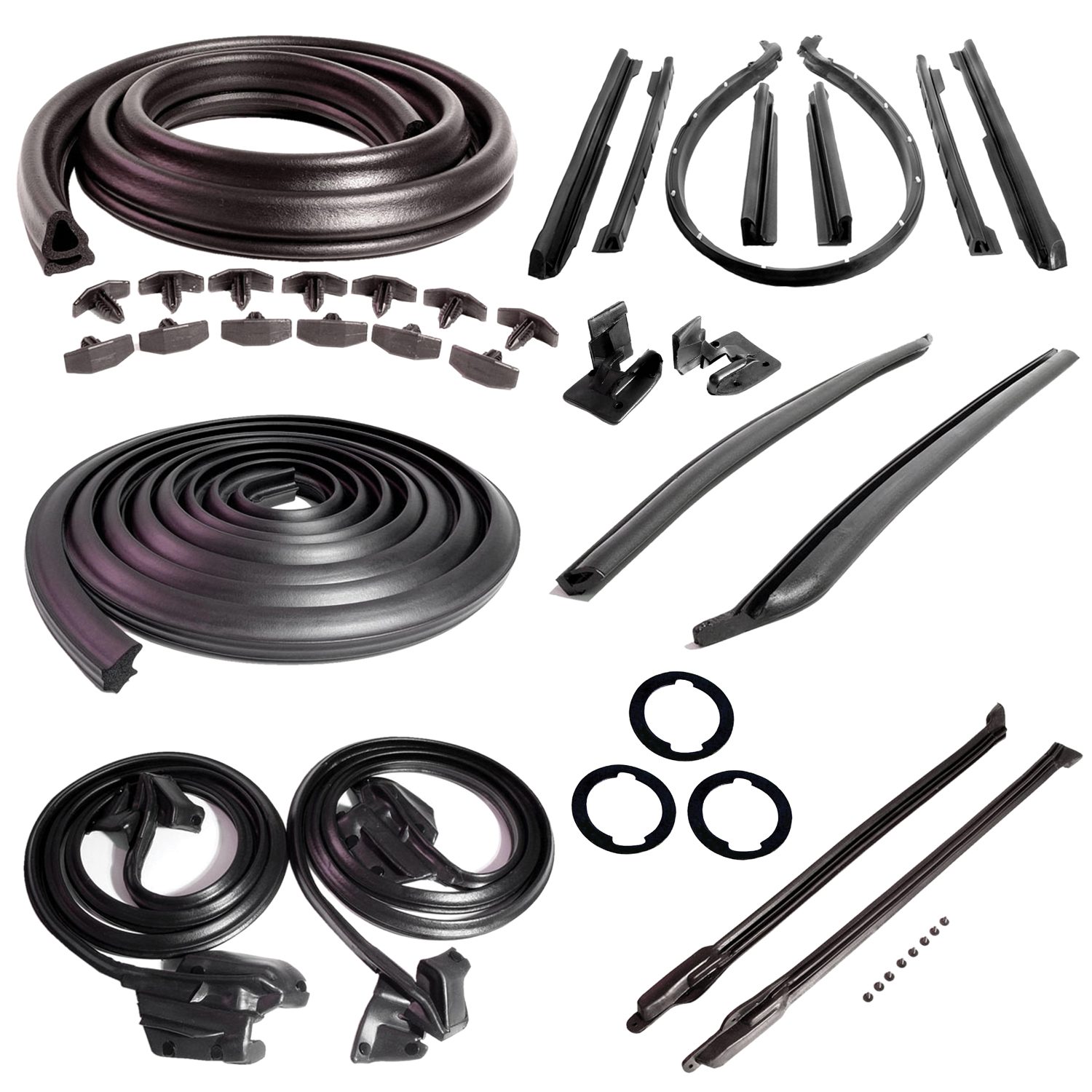 Master Kit for 2-Door Convertibles. Door Seal(LM 12-B), Roof Rail Seal(RR 1610), Trunk Seal(TK 46-16), Door Lock Pillars(ALP 5002-A), 3-Lock Cylinder Pad(UM 1600-100), Rear Roll-up Seal(VS 3-M), Hood/Cowl Seal(CS 5), Pillar Post Seal(CZ 8104) Convenient kit tailored for your vehicle. Every part included is made of the highest quality