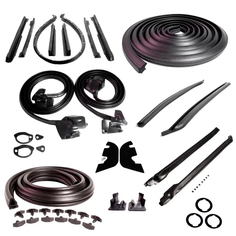 Master Kit. Convertible with plastic inner fenders and without cowl induction. Includes door Seals/Gaskets (LM 12-A), roof-rail Seals/Gaskets (RR 1610), trunk Seal/Gasket (TK 46-16), door lock pillar Seals/Gaskets (ALP 5002), (3) lock cylinder pads (UM 1600-100), rear roll-up Seals/Gaskets (VS 3-M), pillar-post Seals/Gaskets (CZ 8103-A) door handle pads (MP 989-C ~ 4-pc set), inner splash flaps (SI 2003-104) and hood-to-cowl Seal/Gasket (CS 5). Convenient kit tailored for your vehicle. Every part included is made of the highest quality