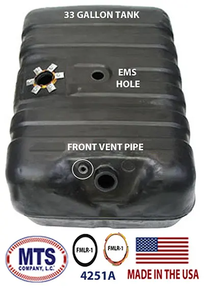 Polyethylene fuel tank for 1978-1979 Ford Bronco Full Size, 33 gallon tank with EMS hole on top. Vent pipe is toward the FRONT of the Bronco. Includes new lock ring and O-ring.