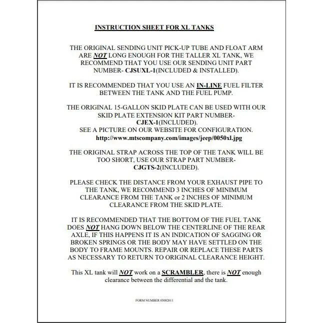 1978-1986 Jeep CJ 21 gallon polyethylene fuel tank. Does NOT come with skid plate. Includes skid plate extensions, new sending unit, lock ring and O-ring, and new top strap. Inline fuel filter is strongly recommended. Not compatible with Jeep Scrambler. This tank is not a replacement for the original 20 gallon plastic tank.