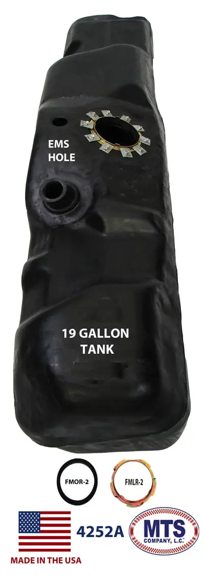 Polyethylene fuel tank for 1985, 1986, 1987, 1988, 1989, 1990, 1991, 1992, 1993, 1994, 1995, 1996 Ford Pickup 19 gallon tank fits pickups with long wheel base 2WD with side tank and most 4WD. Includes new lock ring and O-ring. Length: 58″.