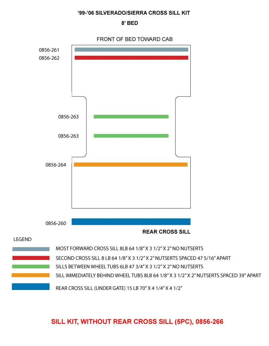 1999-2006 Chevrolet|GMC Silverado|Sierra Cross Sill Kit (w/o Rear Cross Sill) For 8′ Bed, 5pcs