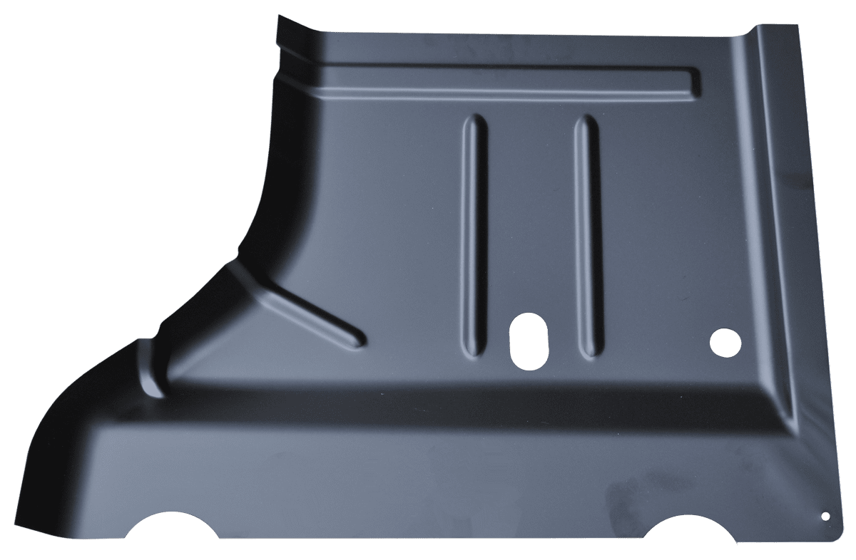 All of our replacement floor panels are stamped steel. The stamping process starts with a 3D scan of an OEM part which produces an OEM-like fitment. The old panel will need to be cut out so that the new one can be welded in its place.