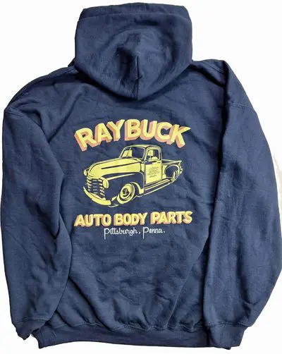 This hoodie is a Gildan Heavy Blend, providing a soft, comfortable fit, with minimal shrinkage. It’s navy blue and has artwork printed on the front and back. The back of the shirt has the image with the truck and the front has the Raybuck logo on the left pocket area.