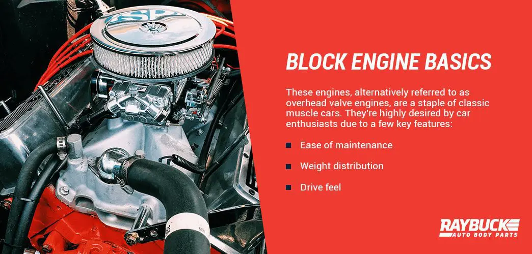- Weight distribution: The engine and its components make up a significant part of a vehicle’s weight, but block engines sit lower in the car, giving the car a lower center of gravity. Many drivers like this for the sake of performance and safety.